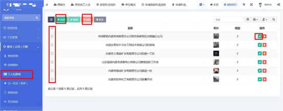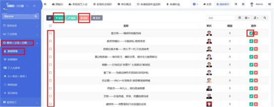 工人先鋒號中查看已錄入的工人先鋒號信息。點(diǎn)擊添加按鈕,輸入姓名,上傳照片,選擇級別,輸入事跡。事跡的內(nèi)容編輯器中支持文字排版、上傳圖片、插入視頻鏈接、插入表格、給文字加超鏈接等功能。點(diǎn)擊確定按鈕保存內(nèi)容,發(fā)布到前端。點(diǎn)擊編輯按鈕,編輯之前發(fā)布的內(nèi)容后點(diǎn)擊確定按鈕保存內(nèi)容,發(fā)布到前端。支持批量刪除,勾選想要?jiǎng)h除的信息,點(diǎn)擊上方按鈕中的刪除按鈕。