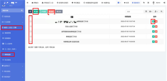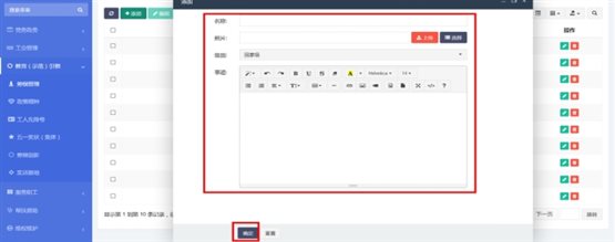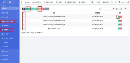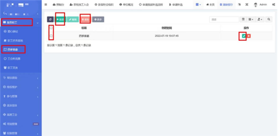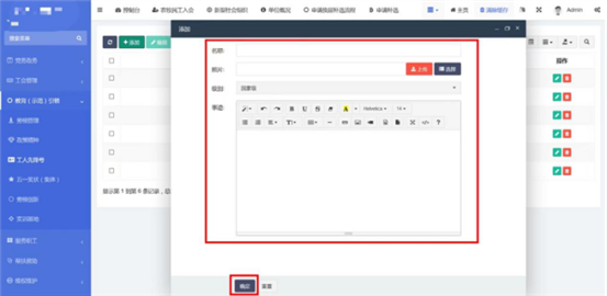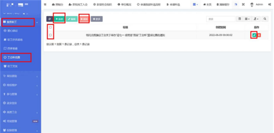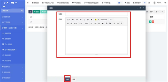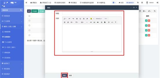 勞模創(chuàng)新中查看已錄入的信息。點(diǎn)擊添加按鈕,輸入標(biāo)題和內(nèi)容。內(nèi)容編輯器中支持文字排版、上傳圖片、插入視頻鏈接、插入表格、給文字加超鏈接等功能。點(diǎn)擊確定按鈕保存內(nèi)容,發(fā)布到前端。點(diǎn)擊編輯按鈕,編輯之前發(fā)布的內(nèi)容后點(diǎn)擊確定按鈕保存內(nèi)容,發(fā)布到前端。支持批量刪除,勾選想要?jiǎng)h除的信息,點(diǎn)擊上方按鈕中的刪除按鈕。