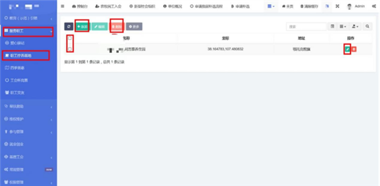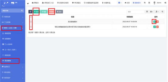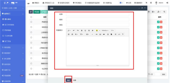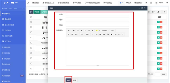 職工療休養(yǎng)基地中查看已錄入的信息。點(diǎn)擊添加按鈕,輸入基地名稱、基地地址、基地坐標(biāo)、基地簡介?;睾喗橹兄С治淖峙虐妗⑸蟼鲌D片、插入視頻鏈接、插入表格、給文字加超鏈接等功能。點(diǎn)擊確定按鈕保存內(nèi)容,發(fā)布到前端。點(diǎn)擊編輯按鈕,編輯之前發(fā)布的內(nèi)容后點(diǎn)擊確定按鈕保存內(nèi)容,發(fā)布到前端。支持批量刪除,勾選想要?jiǎng)h除的信息,點(diǎn)擊上方按鈕中的刪除按鈕。