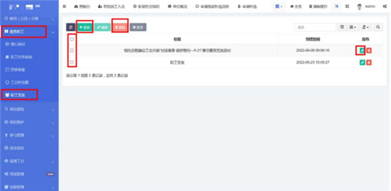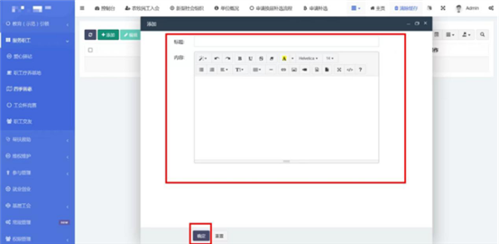 職工交友中查看已錄入的信息。點(diǎn)擊添加按鈕,輸入標(biāo)題和內(nèi)容。內(nèi)容編輯器支持文字排版、上傳圖片、插入視頻鏈接、插入表格、給文字加超鏈接等功能。點(diǎn)擊確定按鈕保存內(nèi)容,發(fā)布到前端。點(diǎn)擊編輯按鈕,編輯之前發(fā)布的內(nèi)容后點(diǎn)擊確定按鈕保存內(nèi)容,發(fā)布到前端。支持批量刪除,勾選想要?jiǎng)h除的信息,點(diǎn)擊上方按鈕中的刪除按鈕。